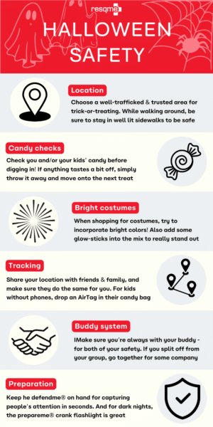 The trusted buddy system is a great way of staying safe in busy environments, and it absolutely applies to Halloween events! Whether you’re in a small or large group, split up into pairs and make sure your “buddy” is always around. You’ll always have someone holding you accountable, and it eases the process so just one person is not looking out for the whole group. And if you do choose to split off from the group, make sure to take your buddy along with you!